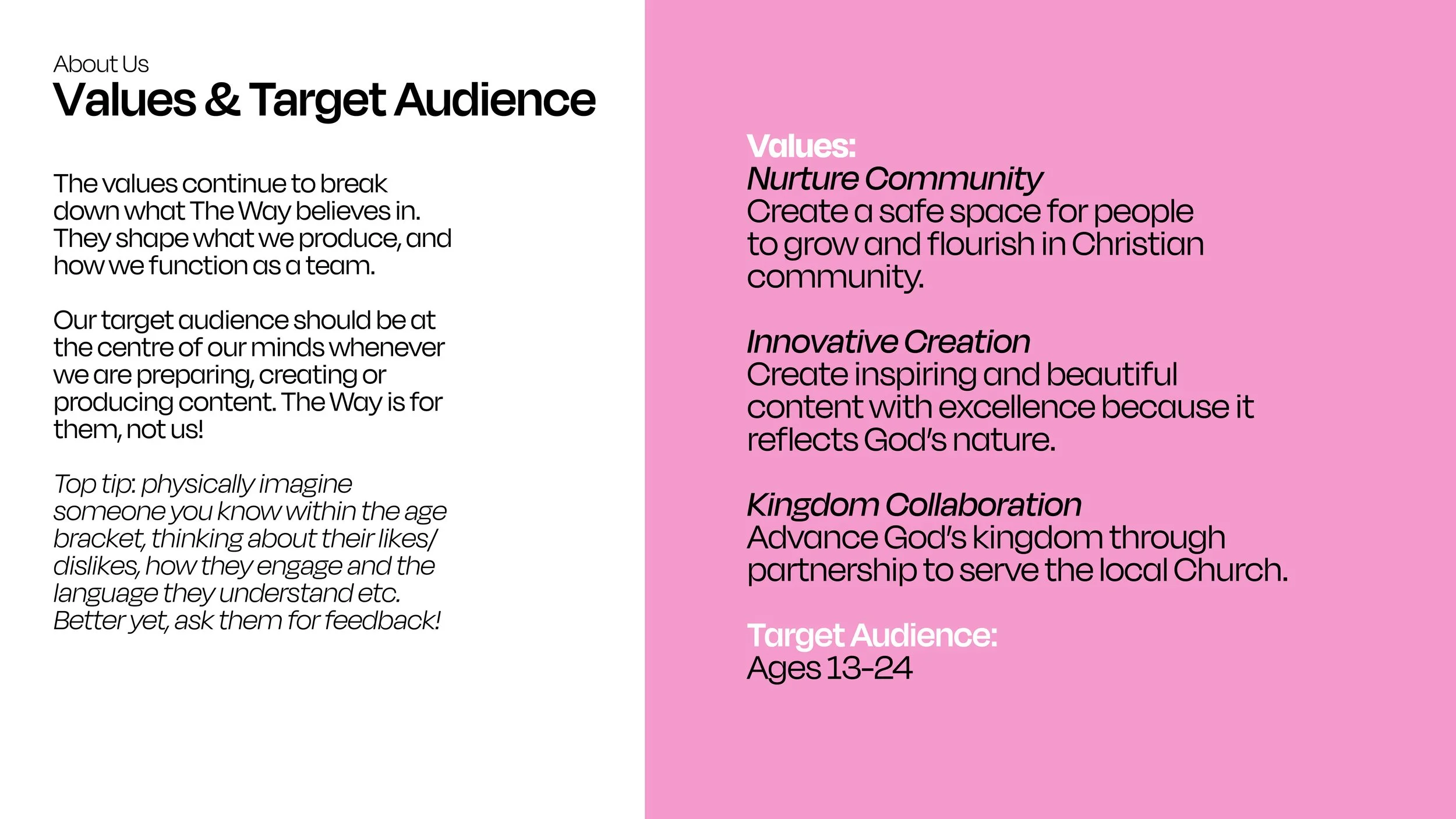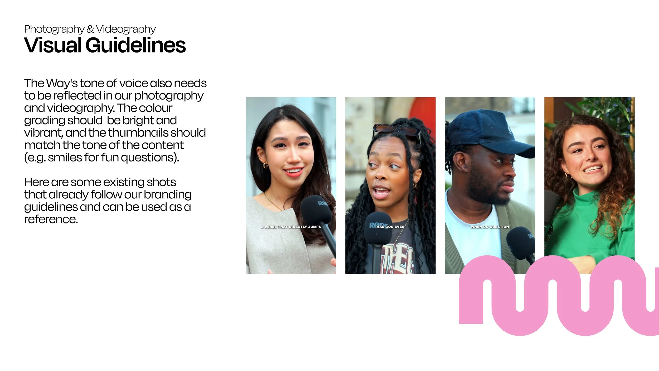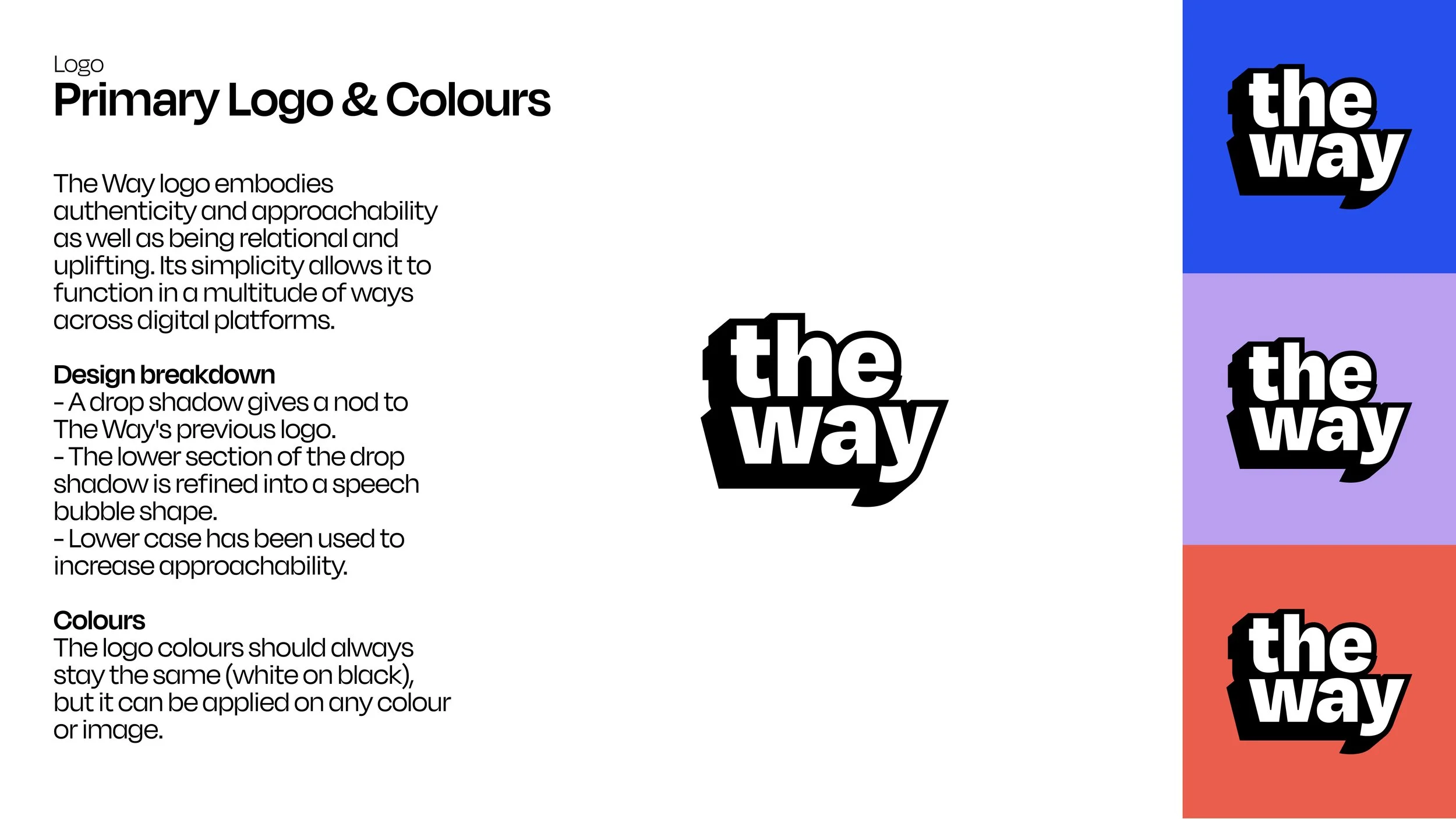 The Way’s content is predominantly digital, featuring photo and video elements. To ensure a vibrant and youthful aesthetic, the colours need to stand out on screen. The branding guidelines outline specific rules for colour usage and pairings, detailing where each colour should be applied and which combinations work best.